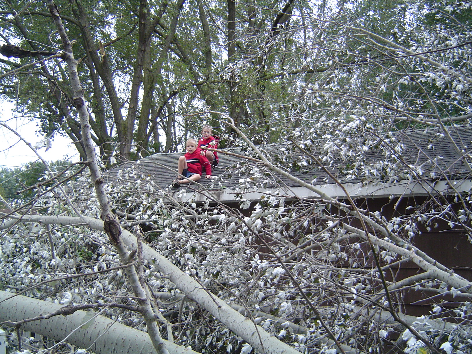 Again from my journal: “All street lights and stop lights were out, and then on County Road H we had to drive on the sidewalk to get past some downed trees. All along that two-minute drive we saw trees and branches strewn everywhere. We finally got home and found that our two trees to the left of the driveway were down and across the driveway. Debbie cried.”